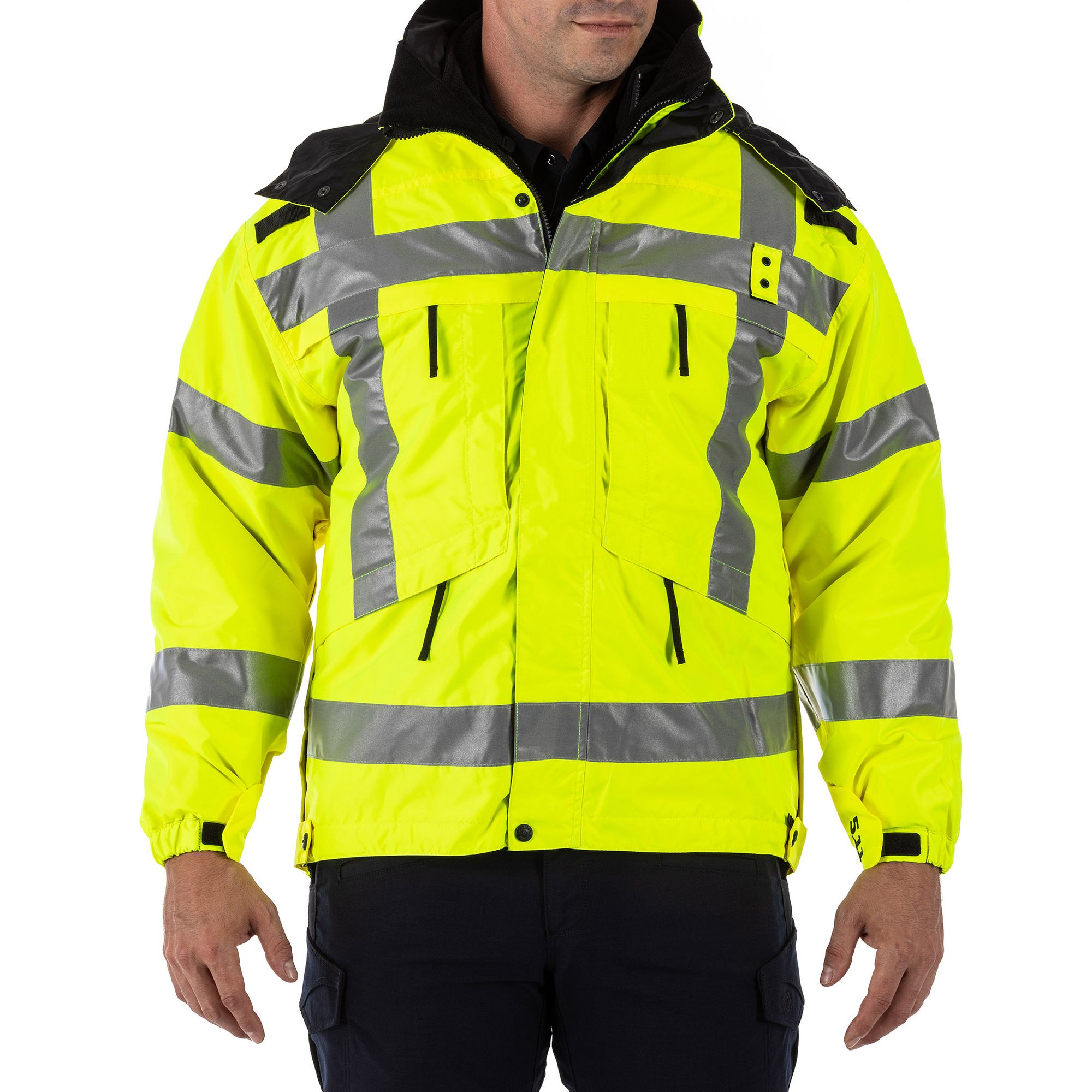 Outer jacket is reversible 5K/3K waterproof/breathable. Fully seam sealed 3M® Scotchlite® reflective tape Center front zipper with external storm flap and chin guard Detachable hood with stash pocket at lower back body Badge tab kit Horizontal left/right chest zipper pockets Left/right chest ReadyPocket™ TacTec® compatible Side seam/underarm zippers for internal access and venting Hand zipper pockets Adjustable hem with internal shock cord system Warm and breathable removable inner fleece jacket 5.11[] embroidery at outer jacket left cuff tab 12 pockets