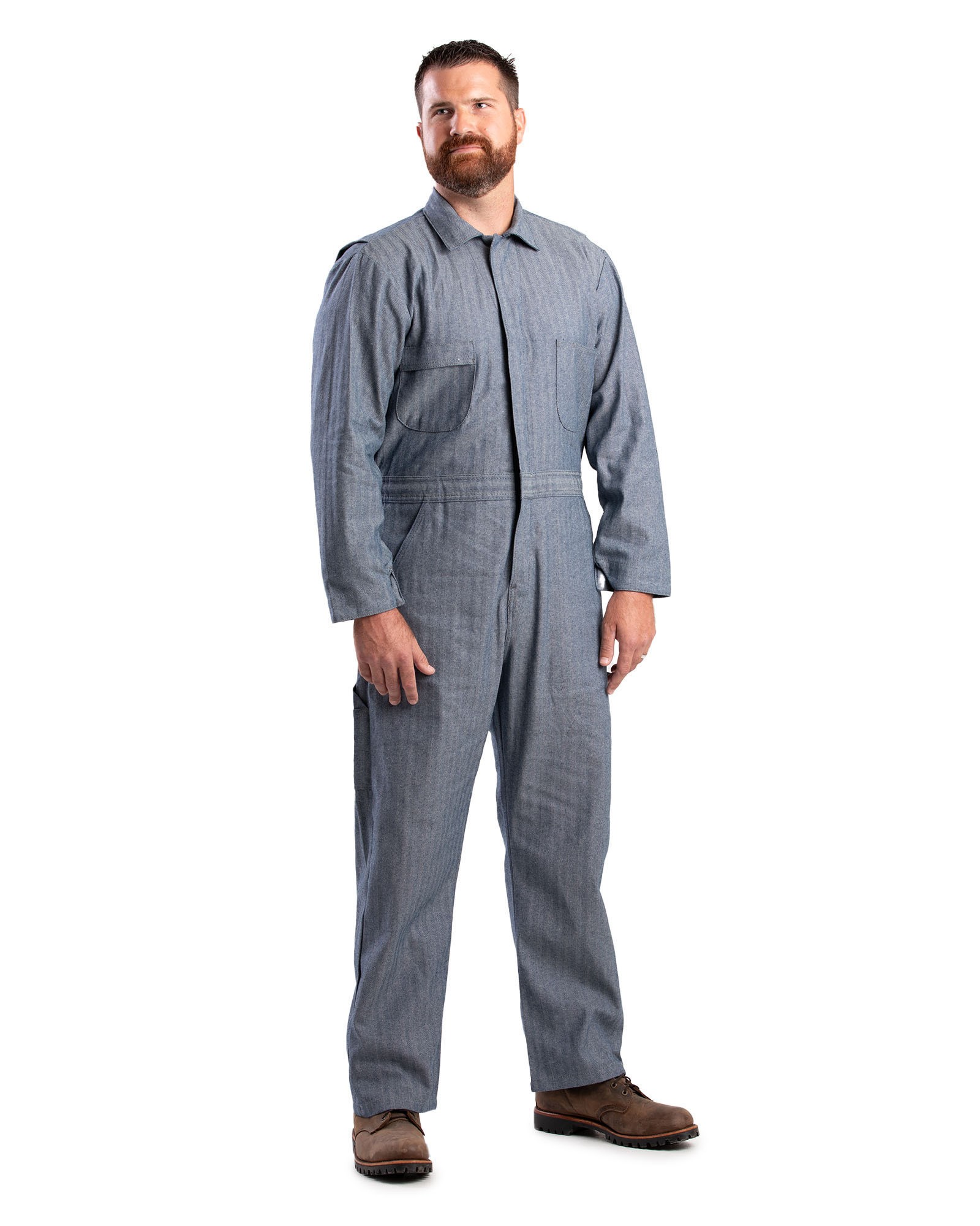 Two snaps on lapel and hidden snaps on cuffs provide an adjustable fit Four-needle stitched waistband with elastic inserts provides increased range of motion Two-way brass zipper with locking slider, safety-stitched seams and reinforced bartacks at all stress points keep up with the workday Two chest pockets -- right with flap, left with pencil slot -- two front pockets with side openings, two reinforced back pockets, double rule pockets and hammer loop house various essentials 10 oz cotton twill Safety-stitched seams Pleated Action back Reinforced bartacks at all stress points Two-way front zipper Two chest pockets Two reinforced hip pockets Hammer loop Double rule pockets