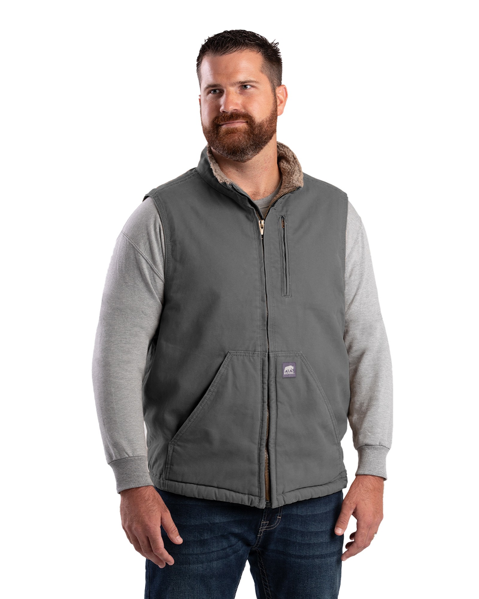 Sherpa-lined front pockets, zip-through collar and extended back trap the heat Brass front zipper, triple-needle stitched main seams and reinforced bartacks at all stress points hold up to tough tasks Three inside chest pockets -- right with zipper closure -- zippered left chest pocket and two front pockets safely store essentials Super-Duty 12 oz. cotton duck Body: Heavyweight sherpa lined Sherpa lined front pockets Extended back Zip-through collar Triple-needle stitched main seams