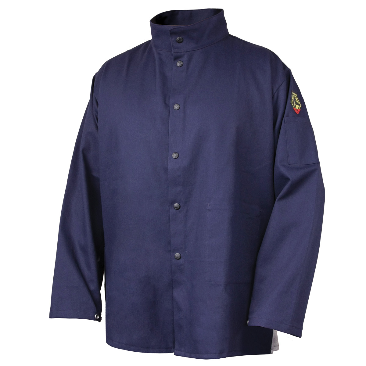 9 oz. FR cotton front, sleeves, & collar (Navy) 7 oz. FR cotton stretch knit back (Heather Gray) Stand-up welder's collar for enhanced protection 6 powder-coated stainless steel front snaps & wrist snaps Leather reinforcements on all front snaps Scribe pocket holds welding pencils, soapstone, & paint markers Inside pocket keeps small items secure 32 length Sizes: S-4XL