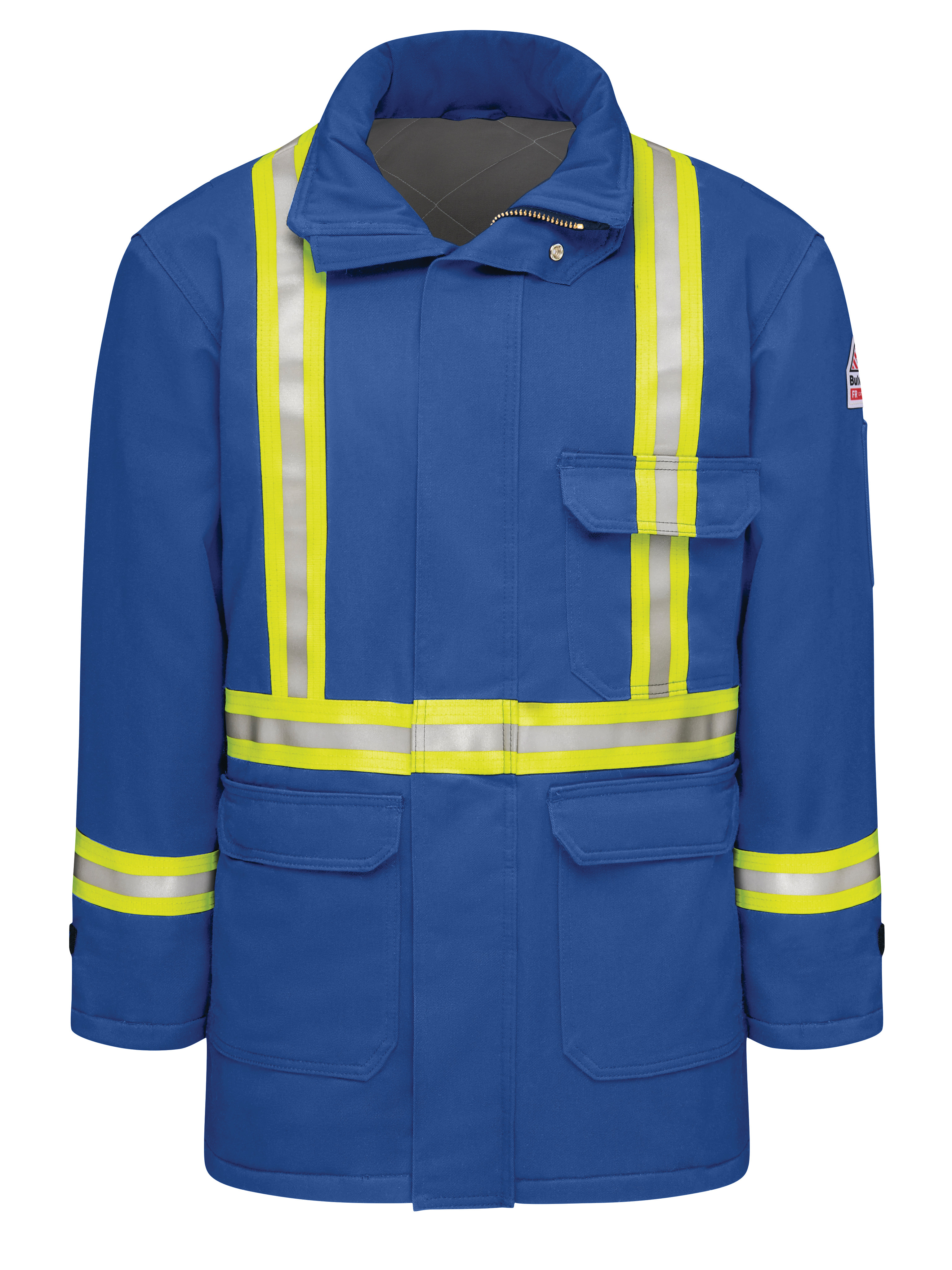 CSA compliant reflective trim - Front & back 2-inch yellow/silver/yellow reflective striping Accommodates snap-on hood HLH2NV, sold separately Two-way, separating, heavy-duty Nomex® taped, brass zipper, fully covered with insulated storm flap, concealed snap closure Fully insulated stand-up collar & knit storm cuffs with hook-and-loop suppression tabs