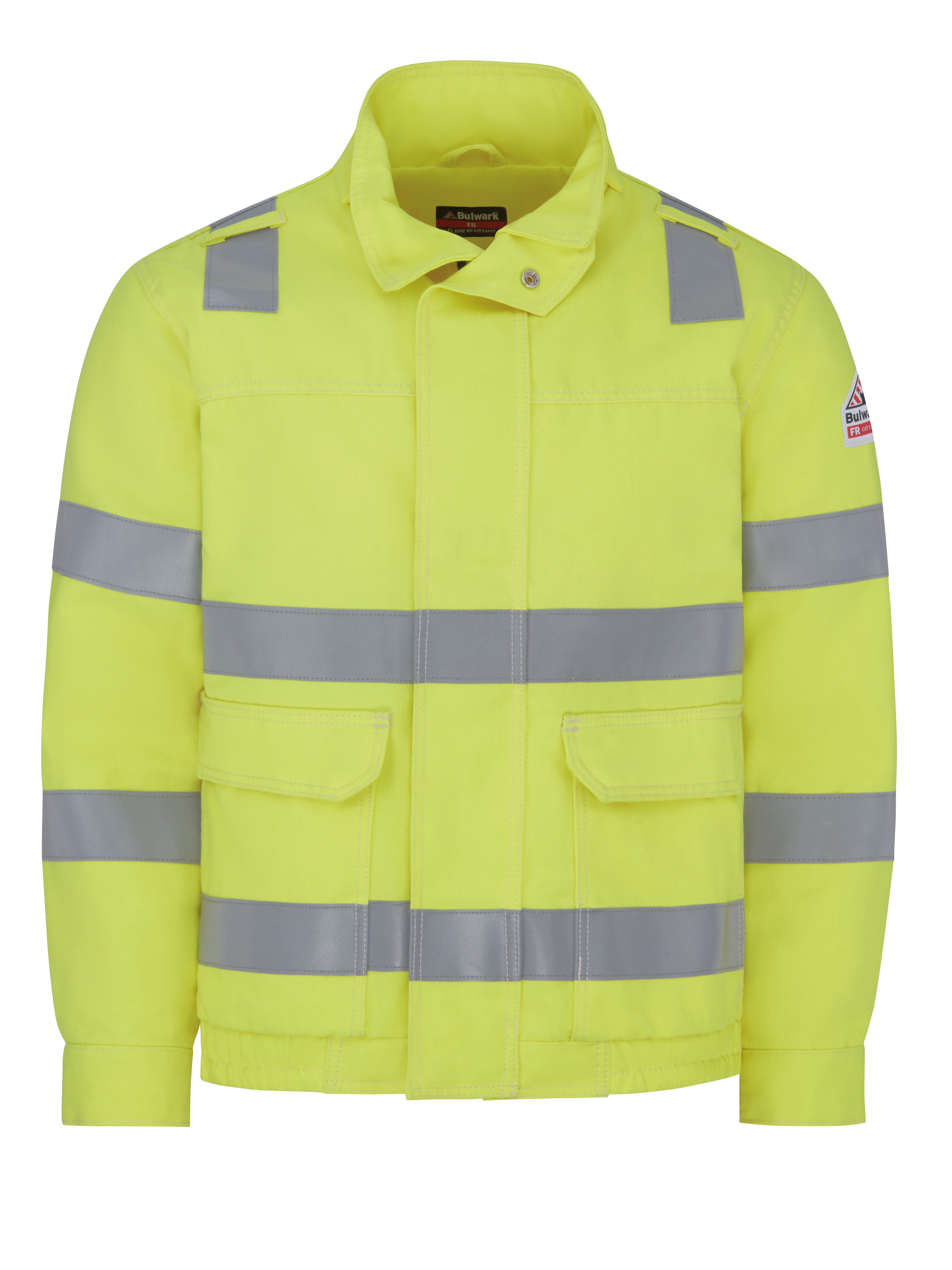 This lightweight, insulated CAT 3 bomber-style jacket is ANSI/ISEA 107 Type R Class 3 Compliant. Features separating, heavy-duty Nomex® taped brass zipper, fully covered with updated collar and storm flap construction. Updated cuff. Utility loop at shoulder. Two external patch pockets, with concealed snap secured flaps with hand warmers. Inside chest pocket. Deep-pleated action back. Elasticized waistband. 360° visibility with front and back 2 silver reflective striping. DWR (Durable Water Repellent) finish. Inside zipper guards on all zippers. Accommodates snap-on hood HMH2HVB and liners LNL8 and LNS8, sold separately.