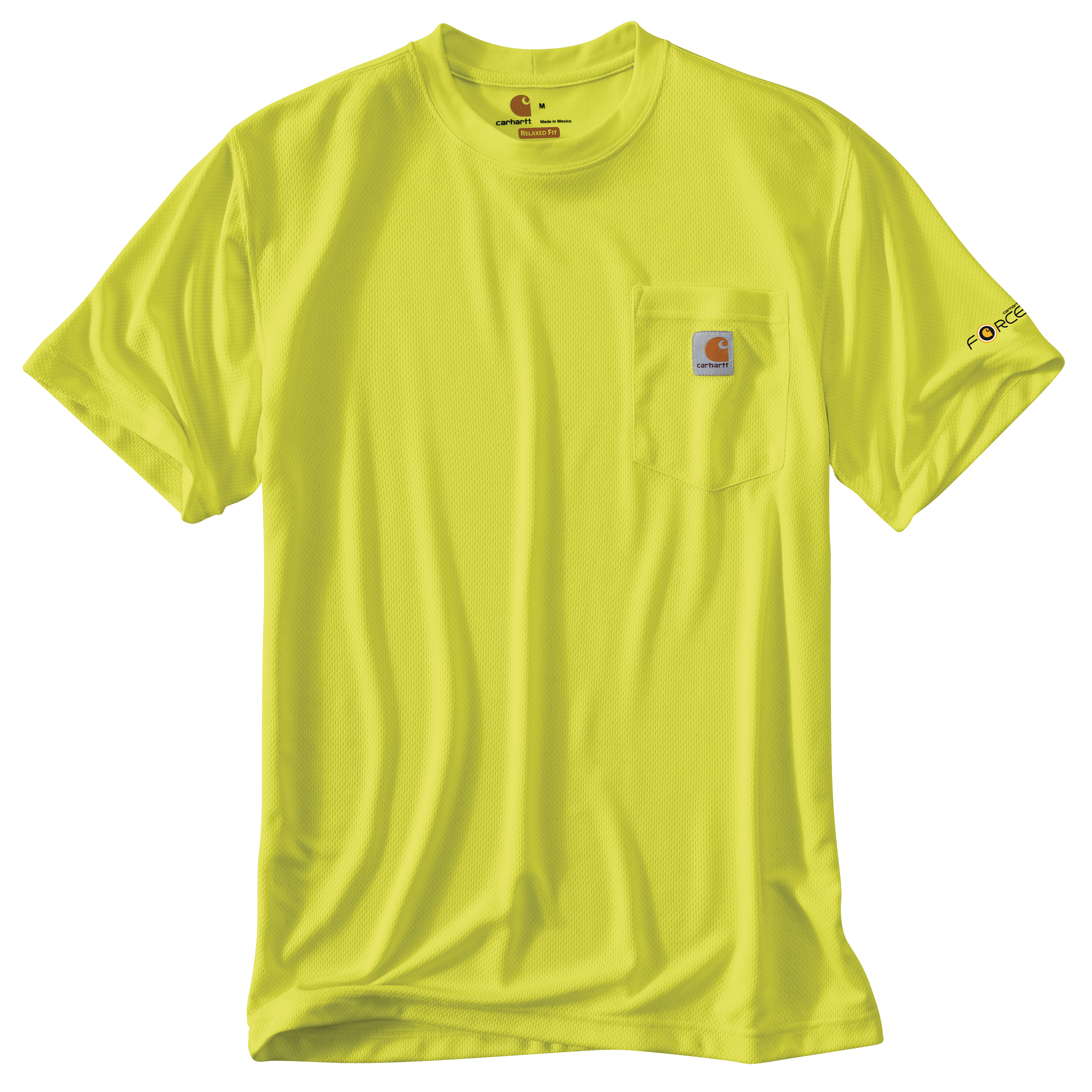 This men's Carhartt t-shirt helps you stay seen on the job with color-enhanced fabric that wicks sweat and repels stains. The relaxed fit offers room to move.
