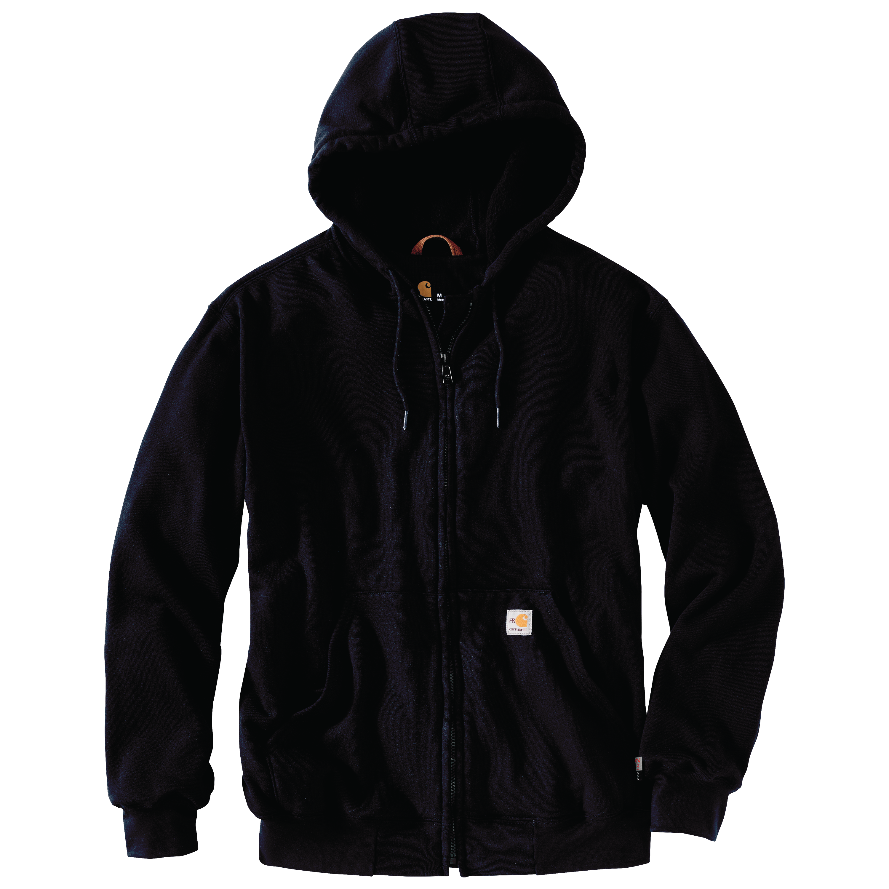 Flame-Resistant Heavyweight Zip-Front Sweatshirt 13-ounce, FR 56% modacrylic / 34% lyocell / 10% aramid FR fleece Meets the performance requirements of NFPA 70E UL® classified to NFPA 2112 Rain Defender® durable water repellent (DWR) Attached hood with adjustable FR drawcord closure Vislon® front zip with Nomex® FR tape Spandex-reinforced rib-knit cuffs and waist Carhartt FR and NFPA 2112/CAT 2 labels sewn on left pocket Two front handwarmer pockets with inner media pocket Inner hook-and-loop pocket Imported