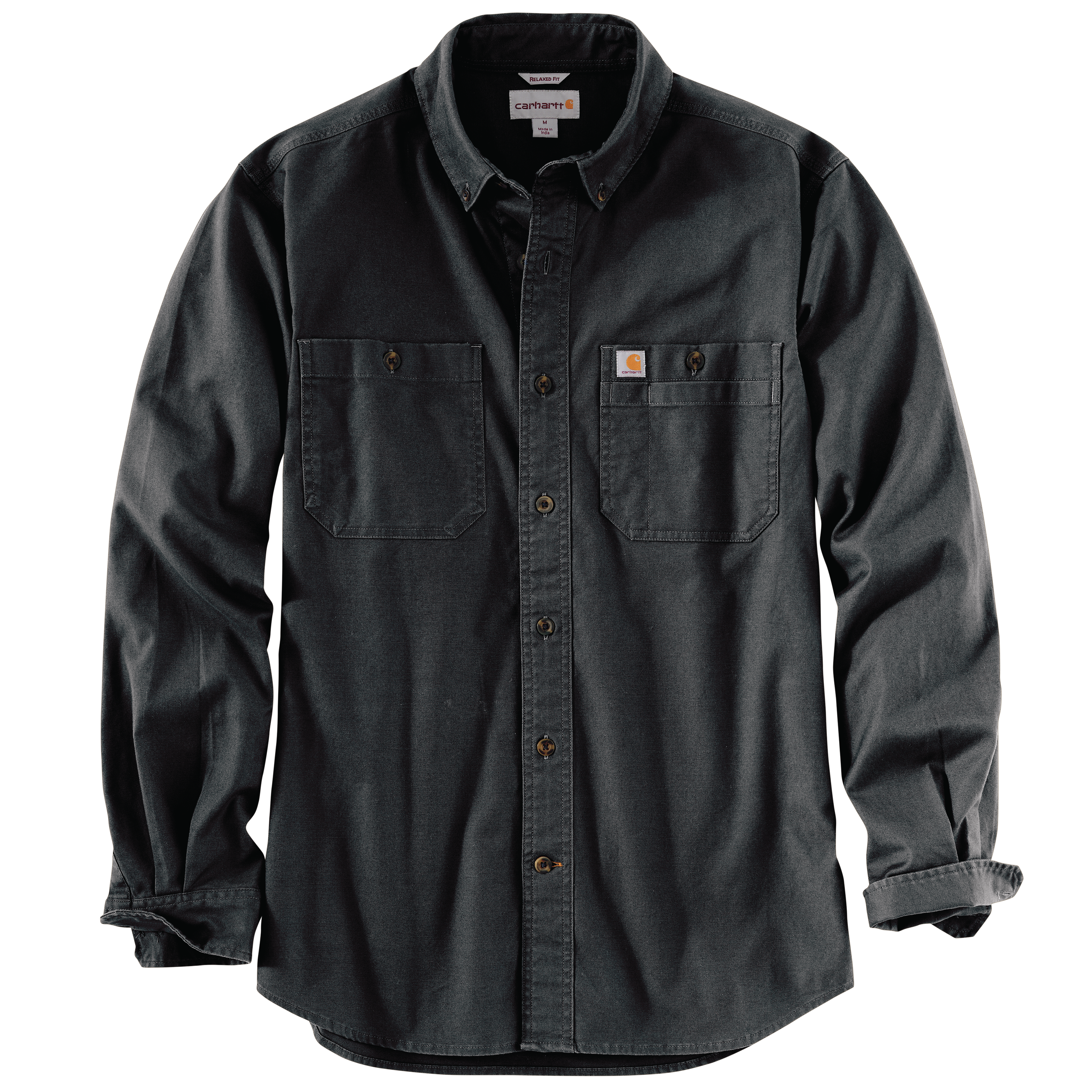 6.5-ounce, 98% cotton/2% spandex Rugged Flex™: Built to stretch and flex with you as you move Two chest pockets with additional left-chest pocket panel for added storage Button-down collar Two-button adjustable cuffs with extended plackets Faux horn buttons Drop-tail hem for additional coverage Carhartt-strong triple-stitched main seams Center back length 32 (medium, regular length): Imported