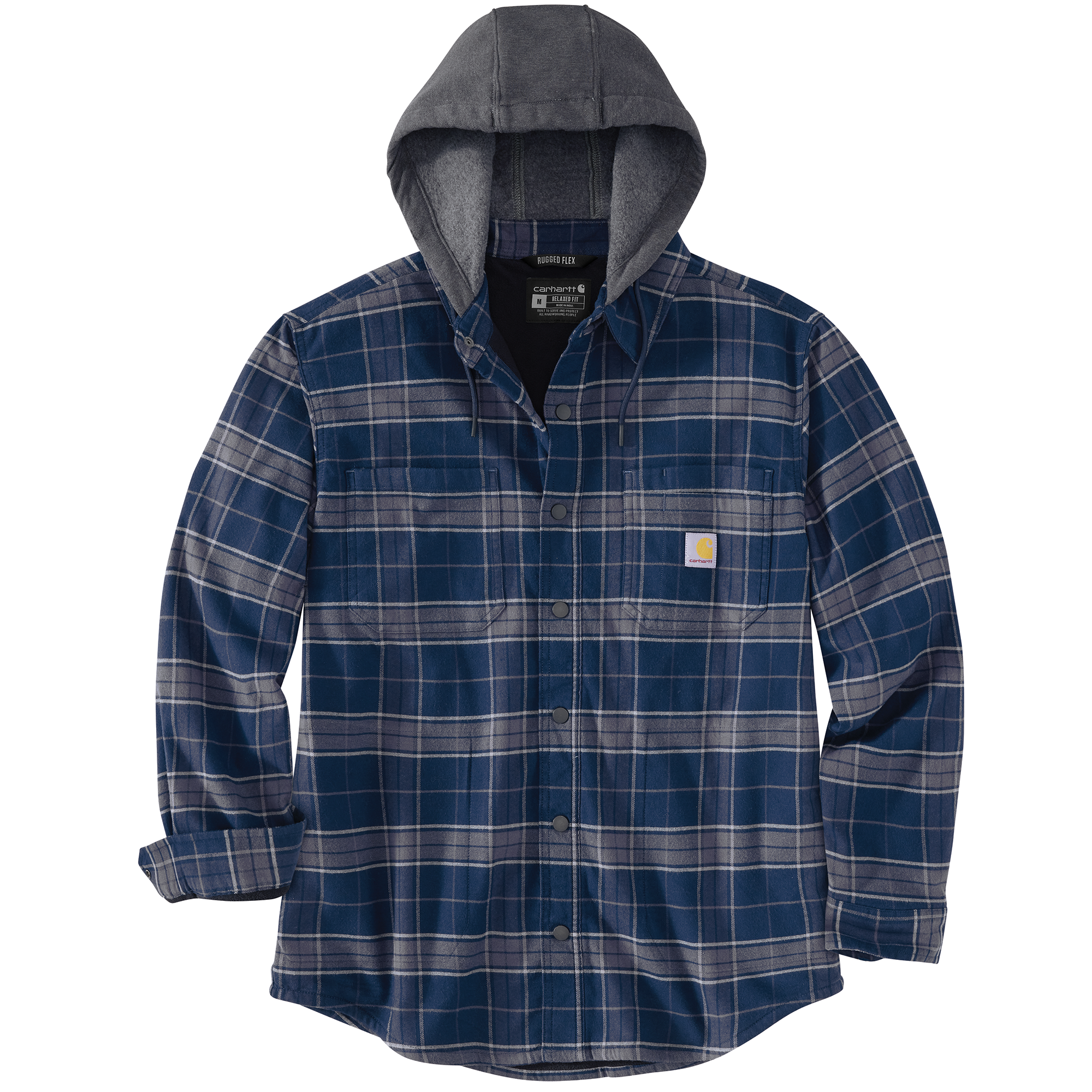 5.6-ounce, 97% cotton / 3% elastane stretch flannel Polyester fleece lining Relaxed fit Snap front with spread collar Attached three-piece lined hood with drawcord closure Two-snap adjustable cuffs with extended plackets Two front handwarmer