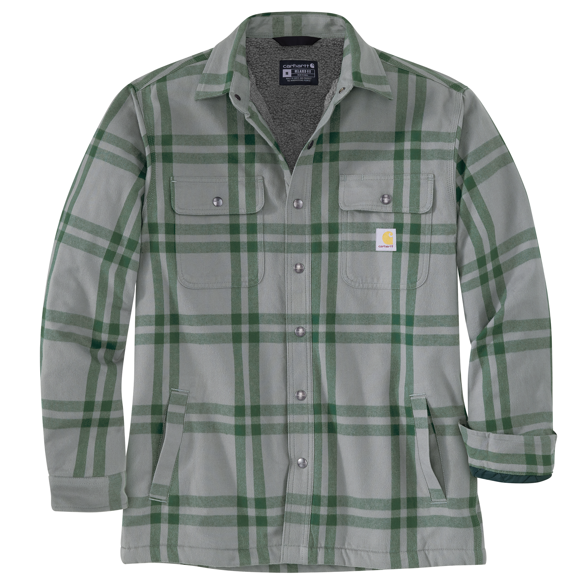 8-ounce, 100% cotton brushed flannel Sherpa lining Relaxed fit Triple-stitched main seams Spread collar Antique-finish snaps Two-snap adjustable cuffs with extended plackets Two flap chest pockets with snap closures Interior chest pocket Replace