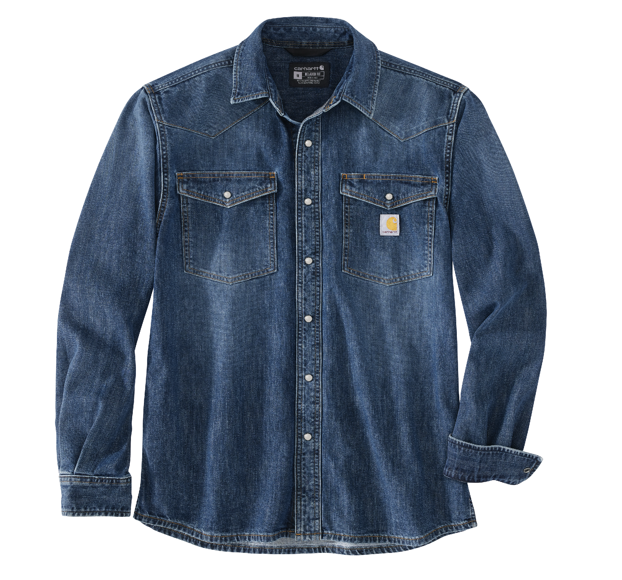 A work-day staple, this men's Carhartt denim long-sleeve shirt is ready for the shop, the farm, or the weekend. It's made in midweight cotton denim with adjustable snaps at the cuffs. A relaxed fit offers a little extra room to move.