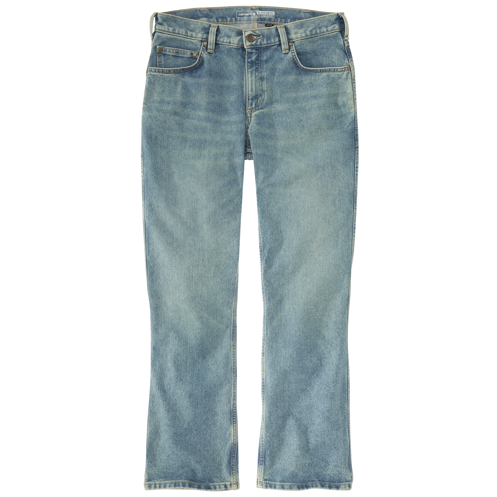 These men's pants combine Carhartt durability with easy-moving flex. Abrasion-resistant denim retains its shape, workday after workday. A relaxed bootcut fit pairs well with your boots.12.5-ounce, 70% cotton / 29% polyester / 1% spandex denim
