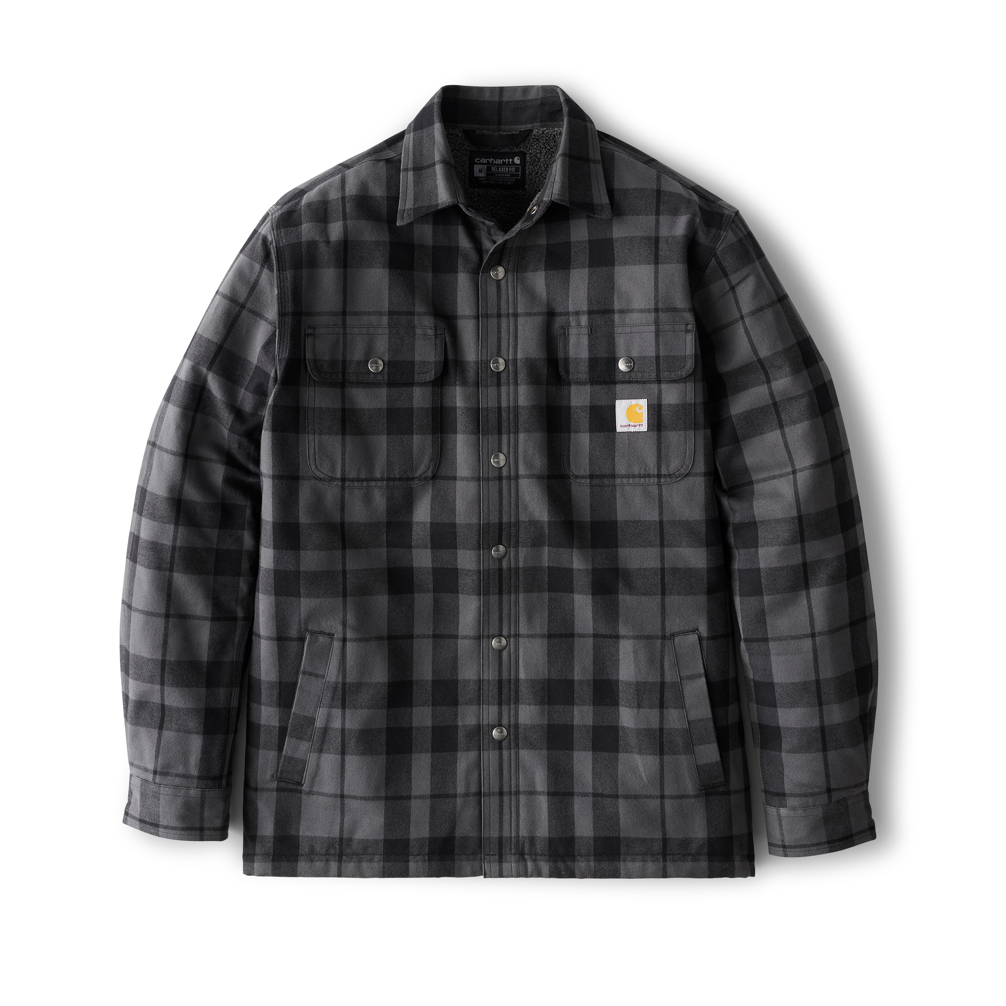8-ounce, 100% cotton brushed flannel Sherpa lining Relaxed fit Triple-stitched main seams Spread collar Antique-finish snaps Two pleats along back yoke seam for ease of movement across the back Two-snap adjustable cuffs with extended plack