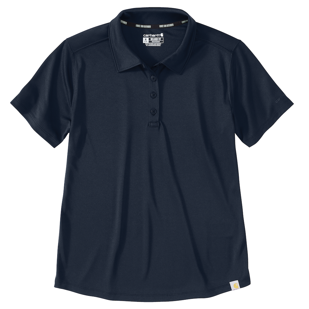 4-ounce, 100% polyester interlock FastDry® technology keeps you cool for all day comfort Force Sun Defender UPF 50+ UV protection Self-fabric polo collar with four-button placket Durable loop at end of placket to store small, hook-fastened equi