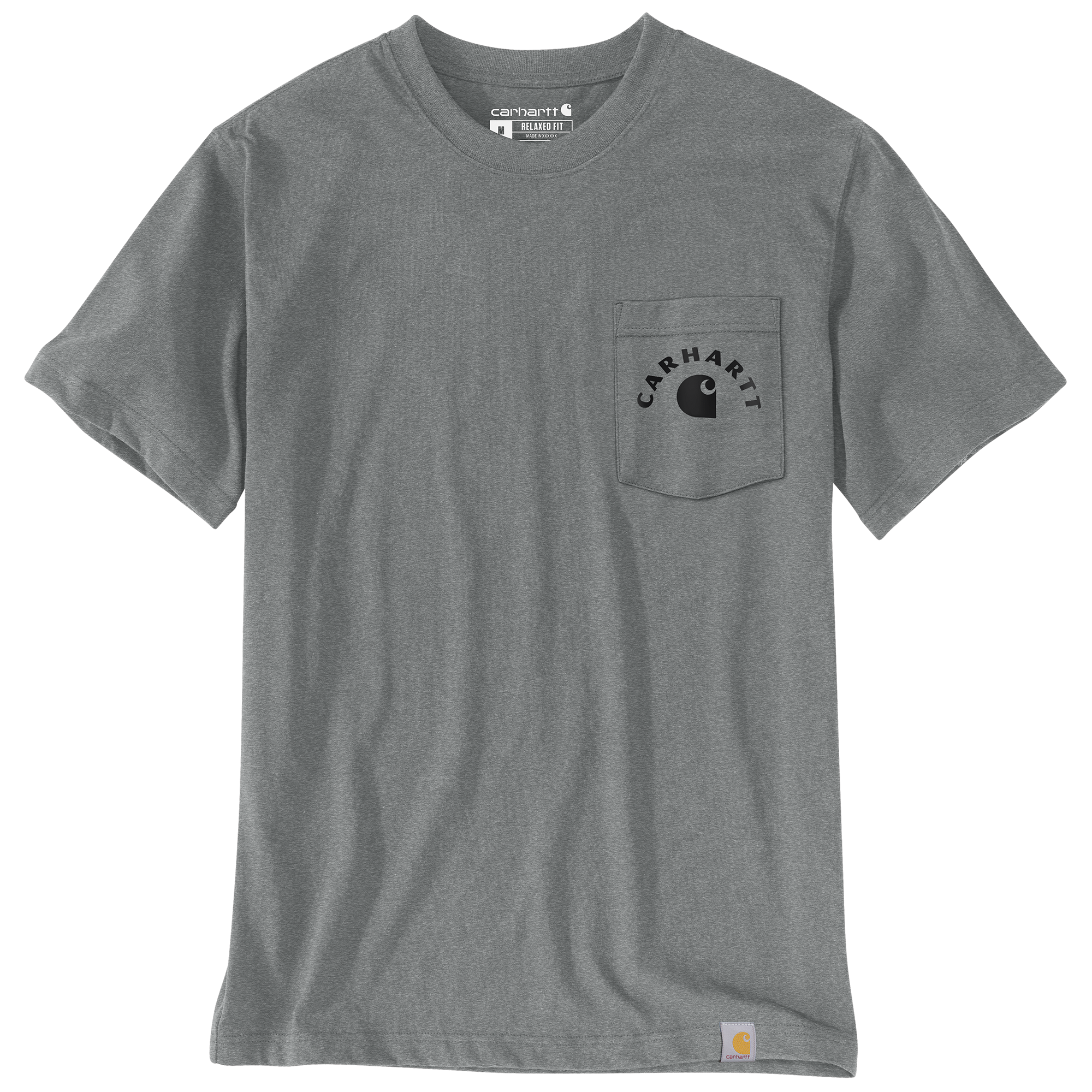 This men's Carhartt t-shirt features work graphics on the front and back. A tough tee with a reinforced pocket, it's built from cotton-blend fabric with a rib-knit collar and cuffs that hold their shape. Made for a relaxed fit that's closer to the body.