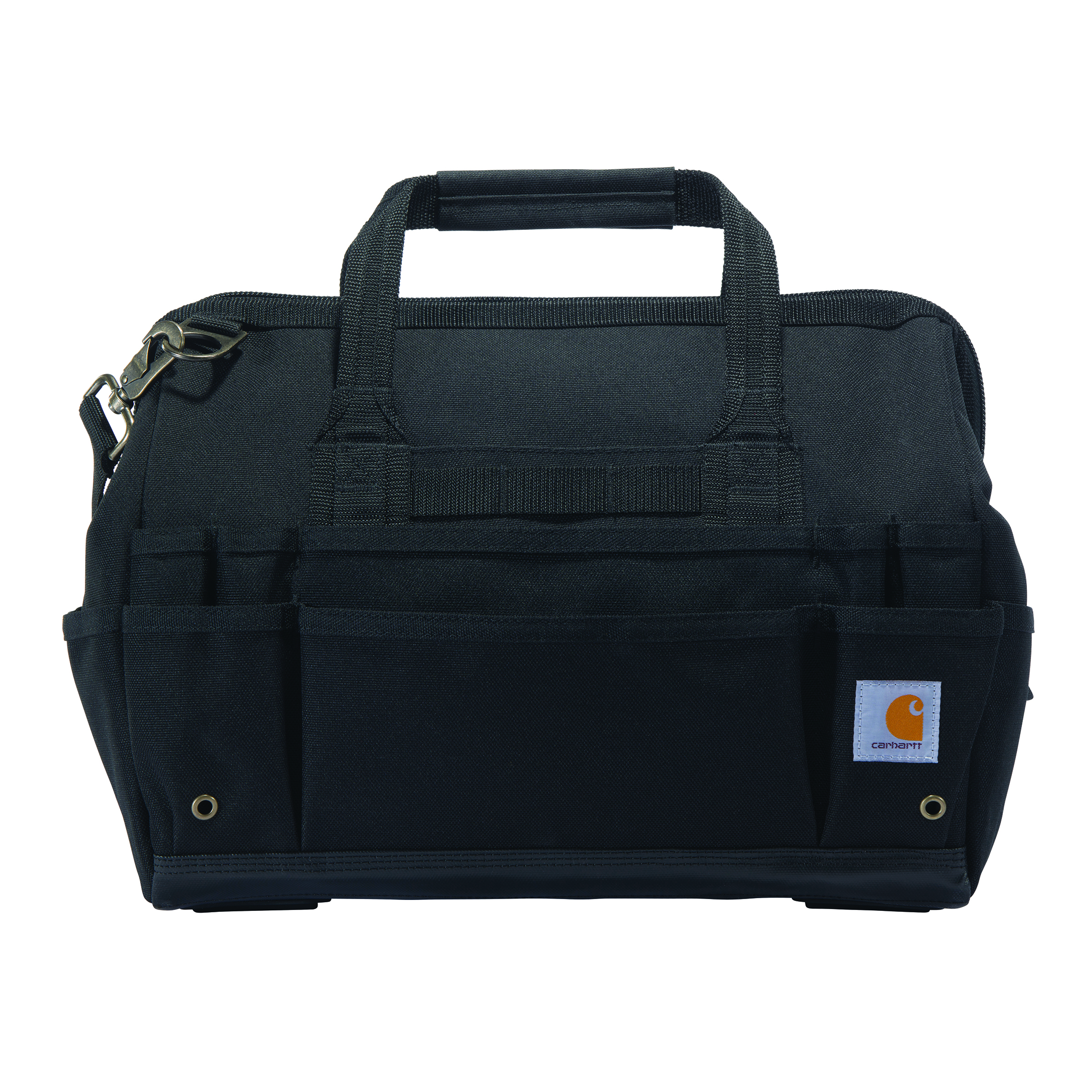 1200 denier polyester with Rain Defender® durable water repellent and Duravax™ abrasion-resistant base Dimensions: 16” X 12” X 9.5” 19 exterior pockets, 3 exterior loops, and 11 Internal metal frame for easy access to large main compartment Interior ID tag Removable, adjustable shoulder strap with pad Model No. CT0352 Country of Origin: Imported