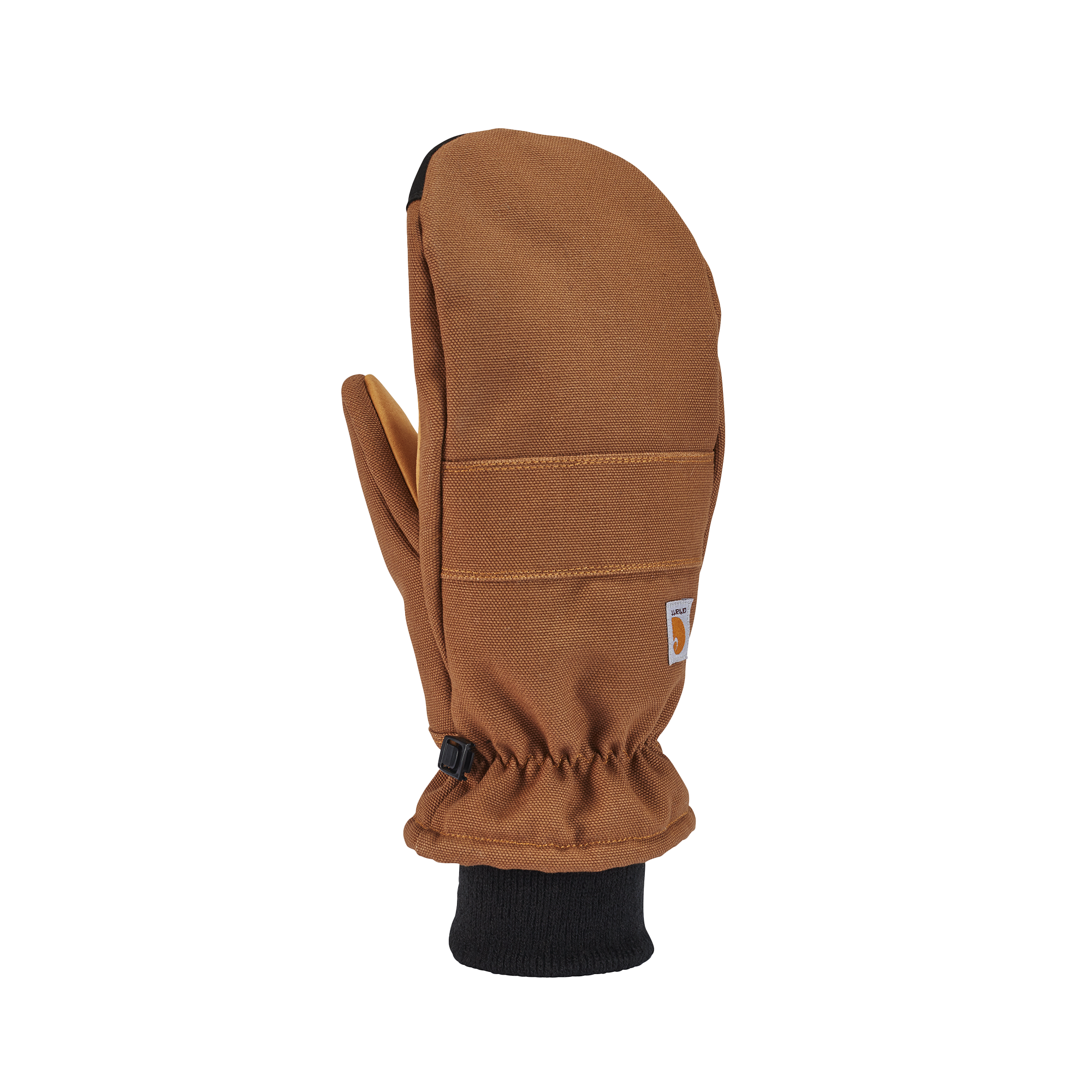 Durable cotton duck shell Ultrasoft insulation; Fleece backhand lining FastDry® technology lining wicks away sweat Knit cuff with elastic at wrist Pull tab for easy on and off Water-resistant synthetic leather palm Country of Origin: Imported