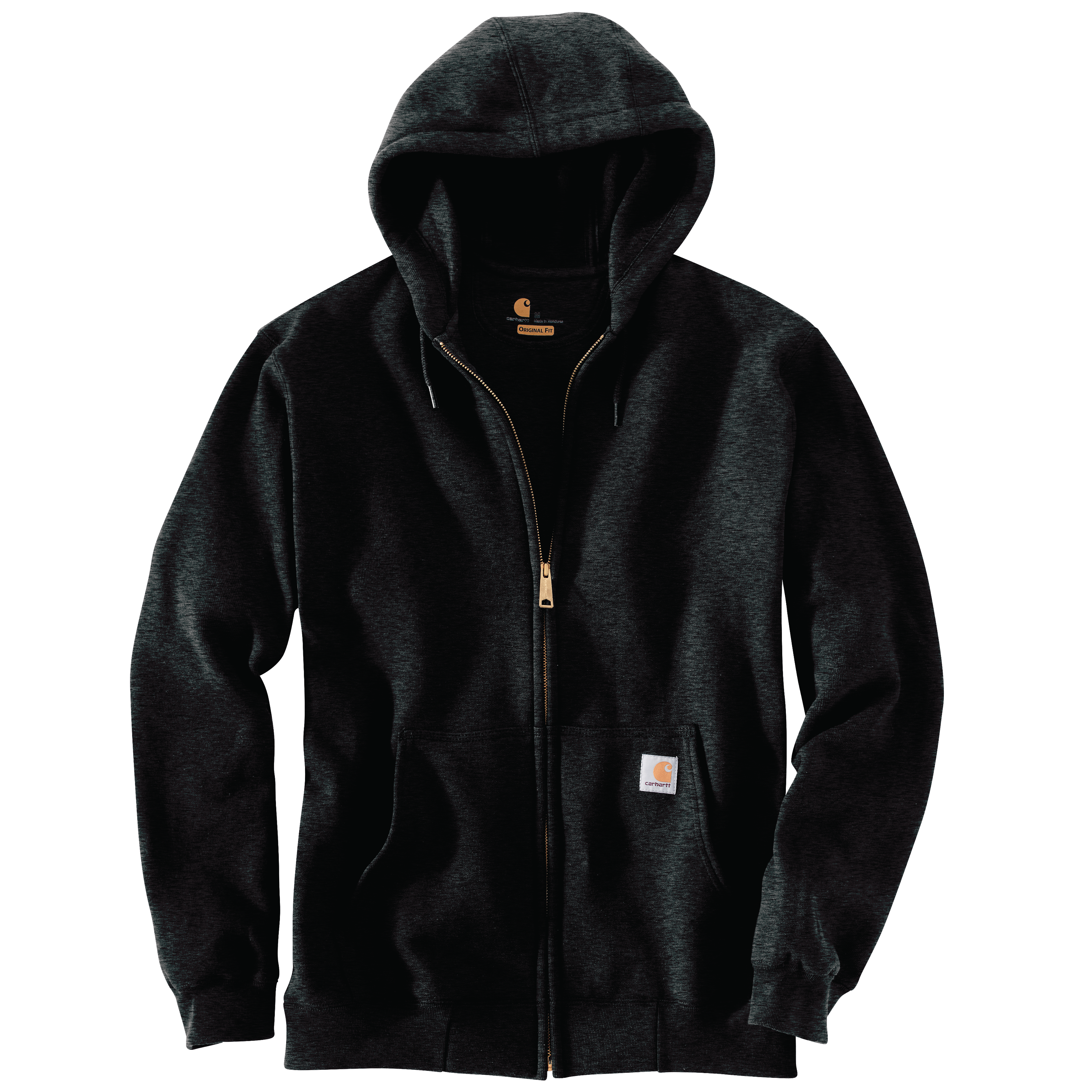 Attached three-piece hood with drawcord closure Full-length brass front zipper Two front handwarmer pockets Stretchable, spandex-reinforced rib-knit cuffs and waistband Carhartt label sewn on pocket Imported