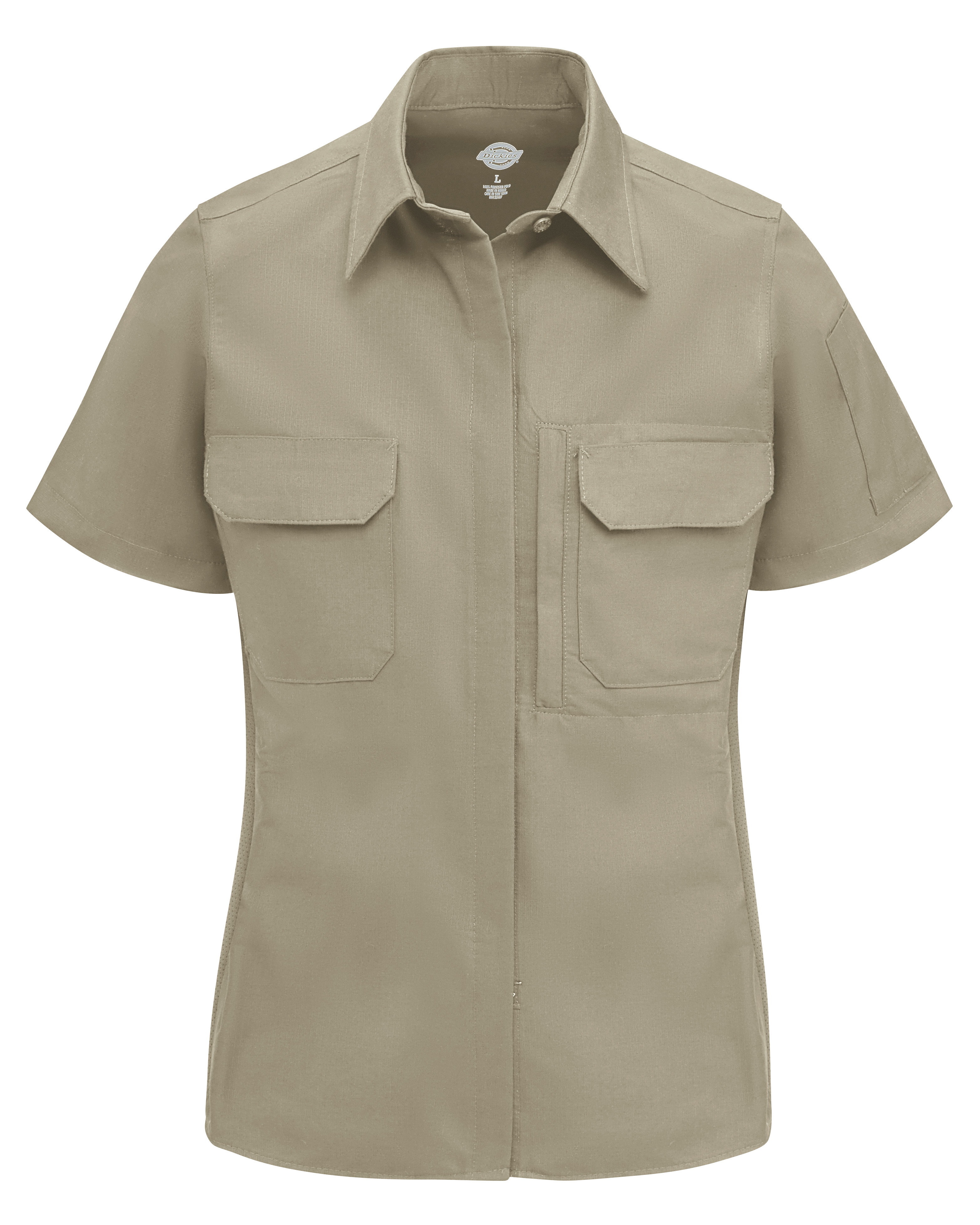 Designed with a woman’s needs in mind, Dickies Women’s Tactical Shirt features the perfect blend of comfort and durability. Its mesh underarms provide cooling ventilation, while its FLEX panels offer the stretch and freedom of movement you need to get the job done. Its large chest pockets offer plenty of secure storage while its crisp professional appearance keeps you looking good shift after shift.