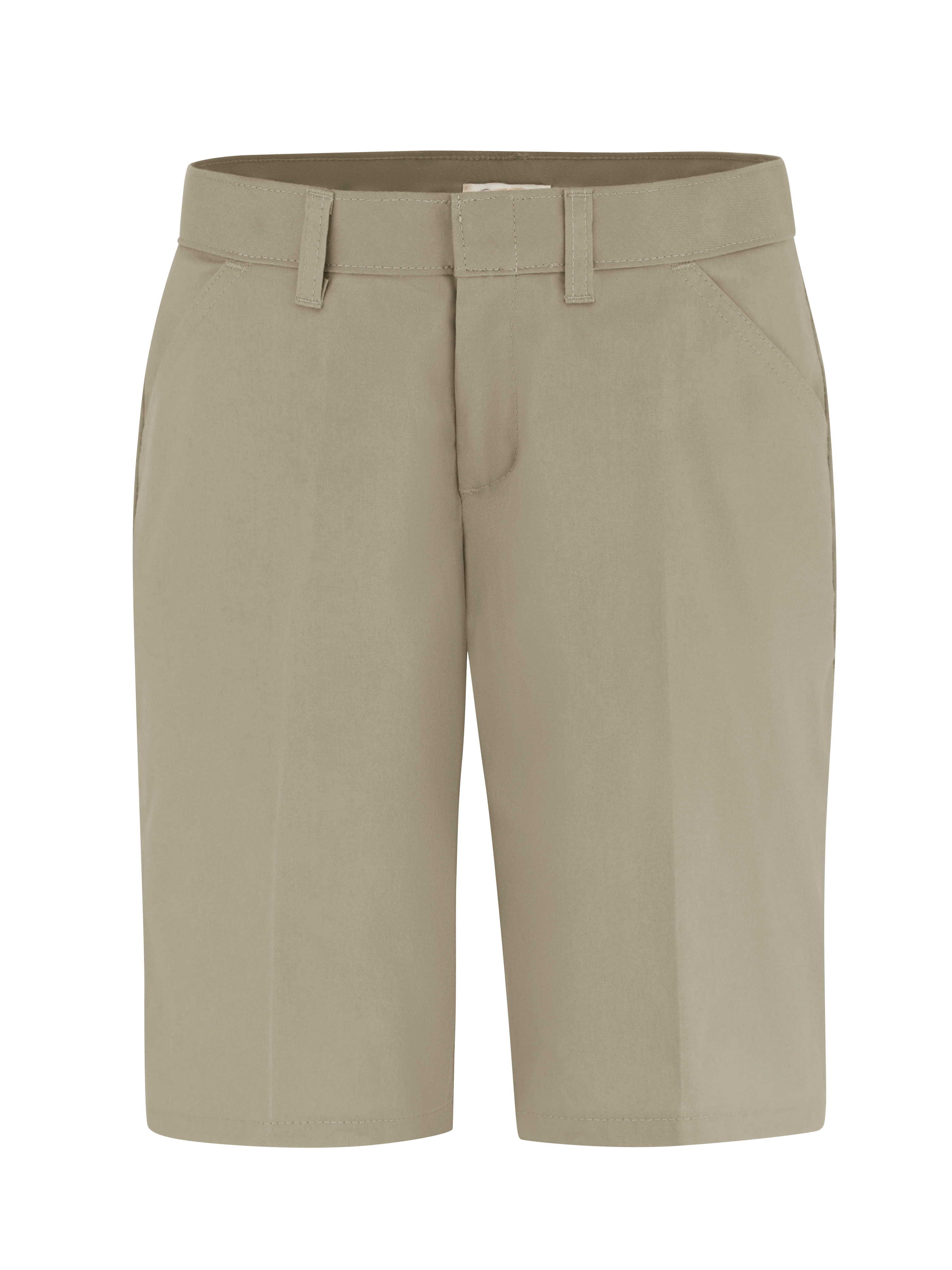 Dickies' Women's 10 Relaxed Fit Flat Front Short sits slightly below the waist and has a stretch interlining in the waistband for expanded comfort in the waist. It features wrinkle resistant, StayDark® and stain release technology. The short is made with two front pockets and a right back-welt pocket for utility.
