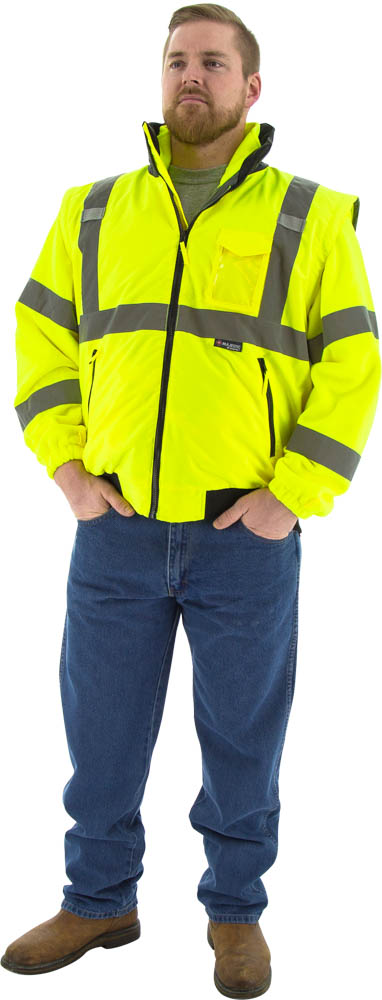 High visibility yellow 8-in-1 Transformer bomber jacker with removable liner Offers 8 varieties of wearing options that include the basic, fully lined Class 3 waterproof jacket ,Class 2 vest, just the Hi Vis Class 3 liner or four more options that can be created depending on the days weather PU coated polyester with reflective striping and concealed detachable hood Warm fleece collar with elastic ribbed waist, & wrist to keep out the cold and water Fully lined and removable sleeves for both jacket and liner Includes inside breast pocket, outside slash pockets, clear ID holder, radio handset chest straps, pen/pencil sleeve pocket, and a cell phone pocket Jacket and Liner meet ANSI / ISEA 107 2015 Class 3, Type R Standard Available sizes: M-6X, LT-4T.