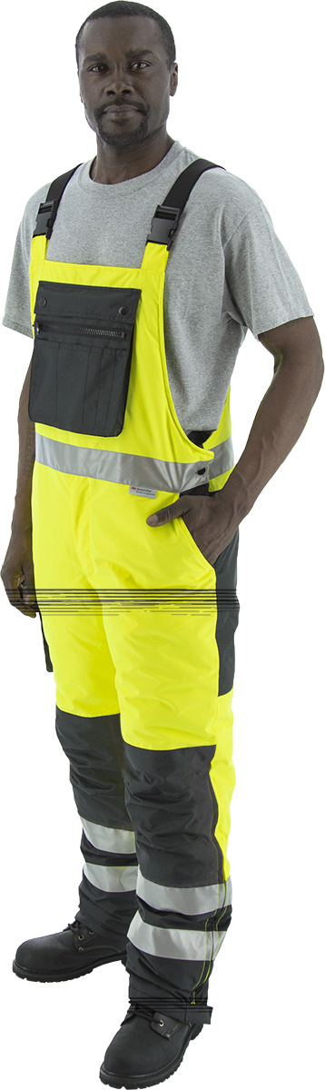 High visibility yellow/black quilted, insulated waterproof bib overall Crotch gusset provides improved mobility and durability Sturdy plastic shoulder strap buckles with reinforced shoulder strap attachment points Includes removable knee pads Two hand warmer waist pockets and right leg cargo pocket Zipper chest pocket with slash side pockets Bottom leg zippers to pull on over boots Snap closures on the bottom of the ankle hem insure a snug fit Black areas are reinforced with nylon ripstop to help prevent tearing and ripping Meets ANSI/ISEA 107-2020 Class E Standard