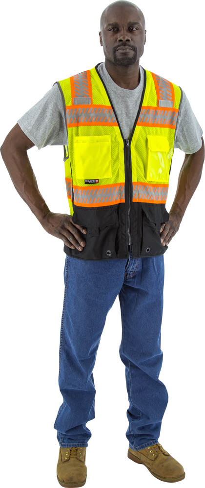 High visibility yellow mesh vest with black bottom for areas that get the most soiled