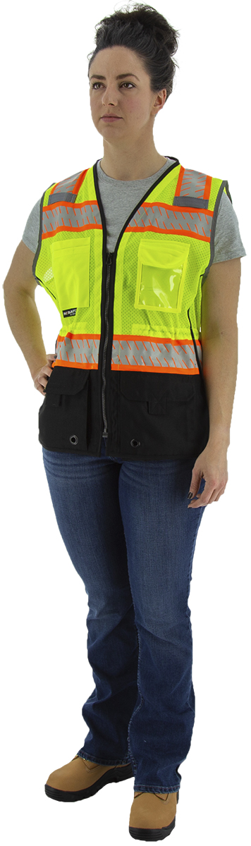 Designed specifically for women, this high-visibility yellow mesh vest features a NEW stretchable fabric that ensures comfort and flexibility for an improved overall fit Extended sizing ensures a comfortable fit for individuals of all sizes DOT striping Reflective chainsaw patterned striping for breathability with DOT contrasting Large chest pen pocket, two large waist pockets with closure Drawstring adjustable waist Side zippers allow relief from binding Two large inside waist pockets, left pocket with security strap for electronic tablet ID badge holder Two radio mic tabs Heavy duty front zipper Meets ANSI/ISEA 107-2020 Class 2, Type R Standard
