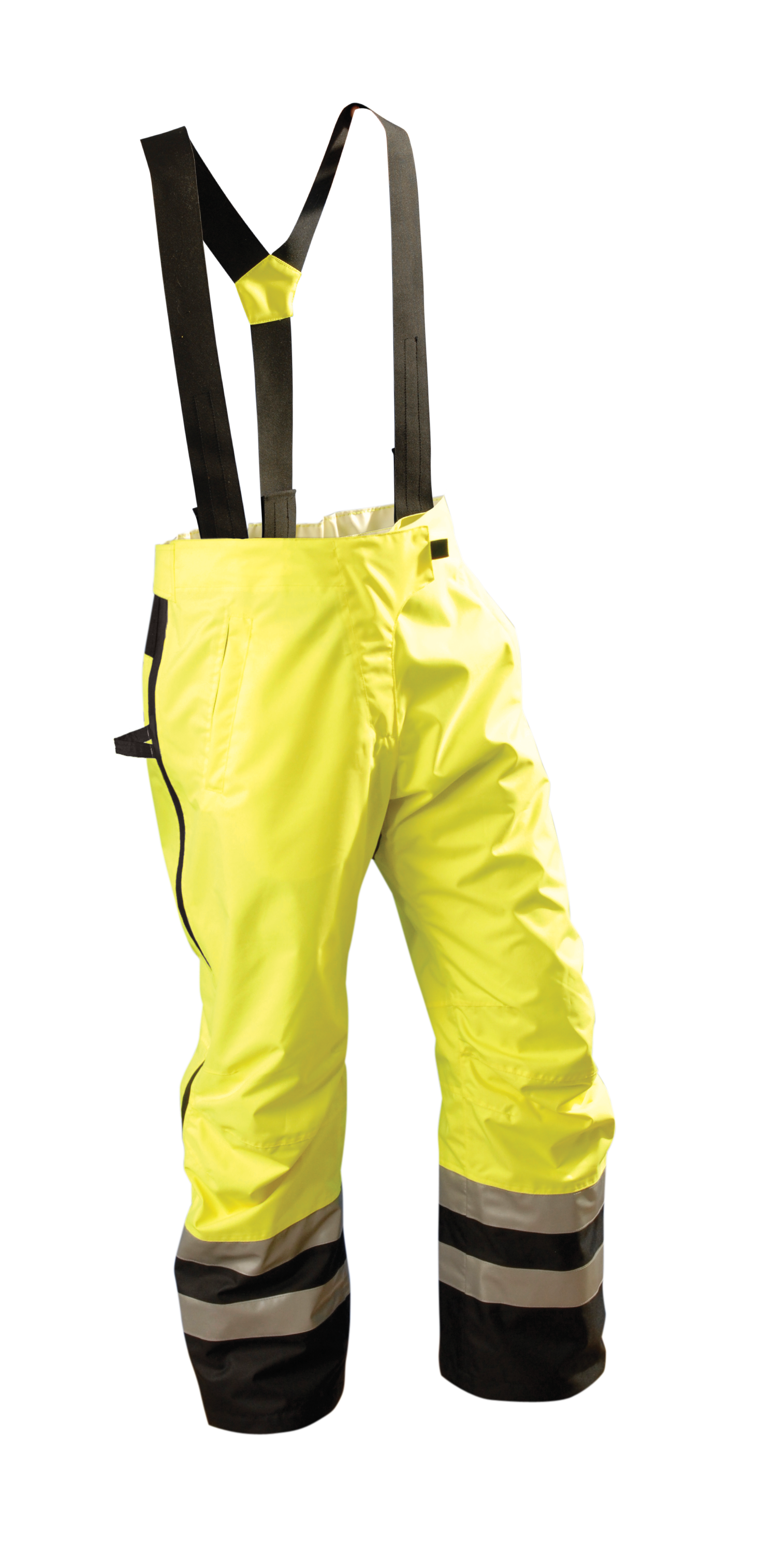 Class E Polyester 300 Denier heavy duty, waterproof Oxford with laminated membrane & sealed seams 2 Reflective Material Full length 2-way waterproof zippers with inside storm flaps offer full access from waist to ankle Detachable black suspenders with hi-viz crosspatch in back Hammer loop to keep tools within reach Articulated knee to provide increased comfort & mobility Waterproof zip fly front and elastic in back waist Hook & Loop Adjustable tab at Ankle Viral Protection ASTM F1671 Compliant Pockets: 2 Front 1 Back with waterproof zippers Class 3 when paired with ANSI shirt, vest or jacket 25 Washes Sizing: M-5X