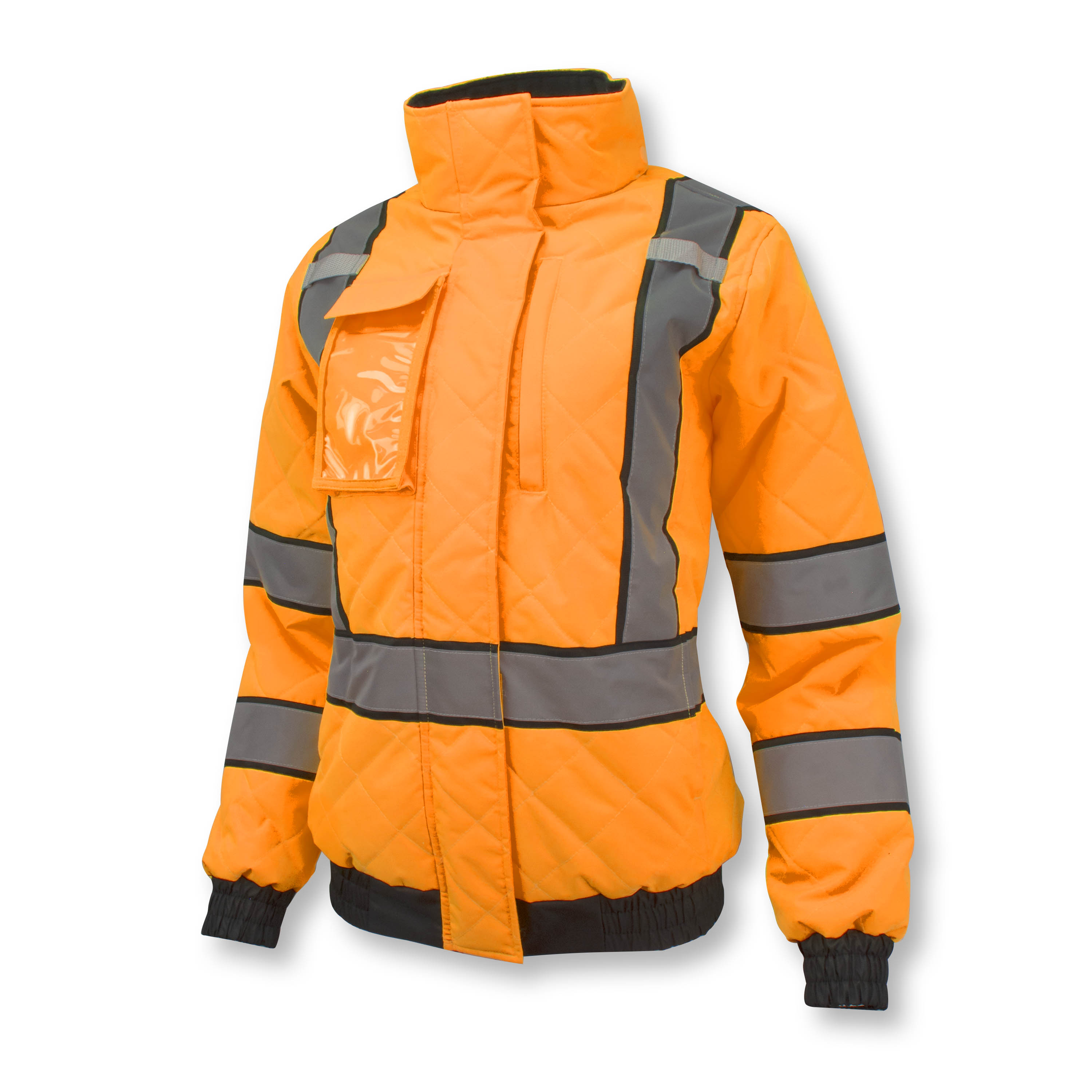 The Radians SJ930-3 Women's Class 3 Quilted Bomber Jacket has a Diamond Quilted PU Coated polyester outer shell, a fleece lined body, and taffeta lined sleeves for easy on/off. A front storm flap and high collar add extra warmth and protection from the elements. It is a Class 3 high visibility rating with silver reflective tape and black contrast trim. Pockets include a radio/phone pocket with clear id pocket, zipper chest pocket, lower hand warmer pockets with zippers, hidden tablet/accessory pocket under storm flap to secure important items, and an inner chest pocket. Features also include a detachable roll away hood with toggle draw cord, and elastic waist and cuffs to help block the cold.