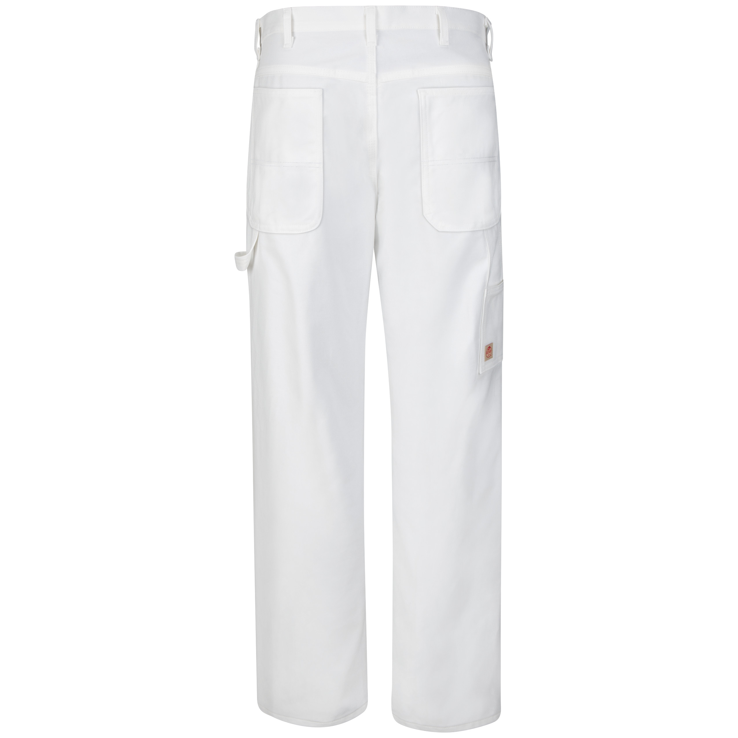 Loose Fit features an updated rise that sits slightly below the waist Cut through seat and thigh to offer maximum mobility with a straight leg that fits over work boots Traditional painter's drill fabric for extra durability Carpenter style with double-rule pocket and hammer loop Bartacks at stress points Decorative stitching on back pockets Triple-needle felled outseam, seatseam, and felled riser seam.