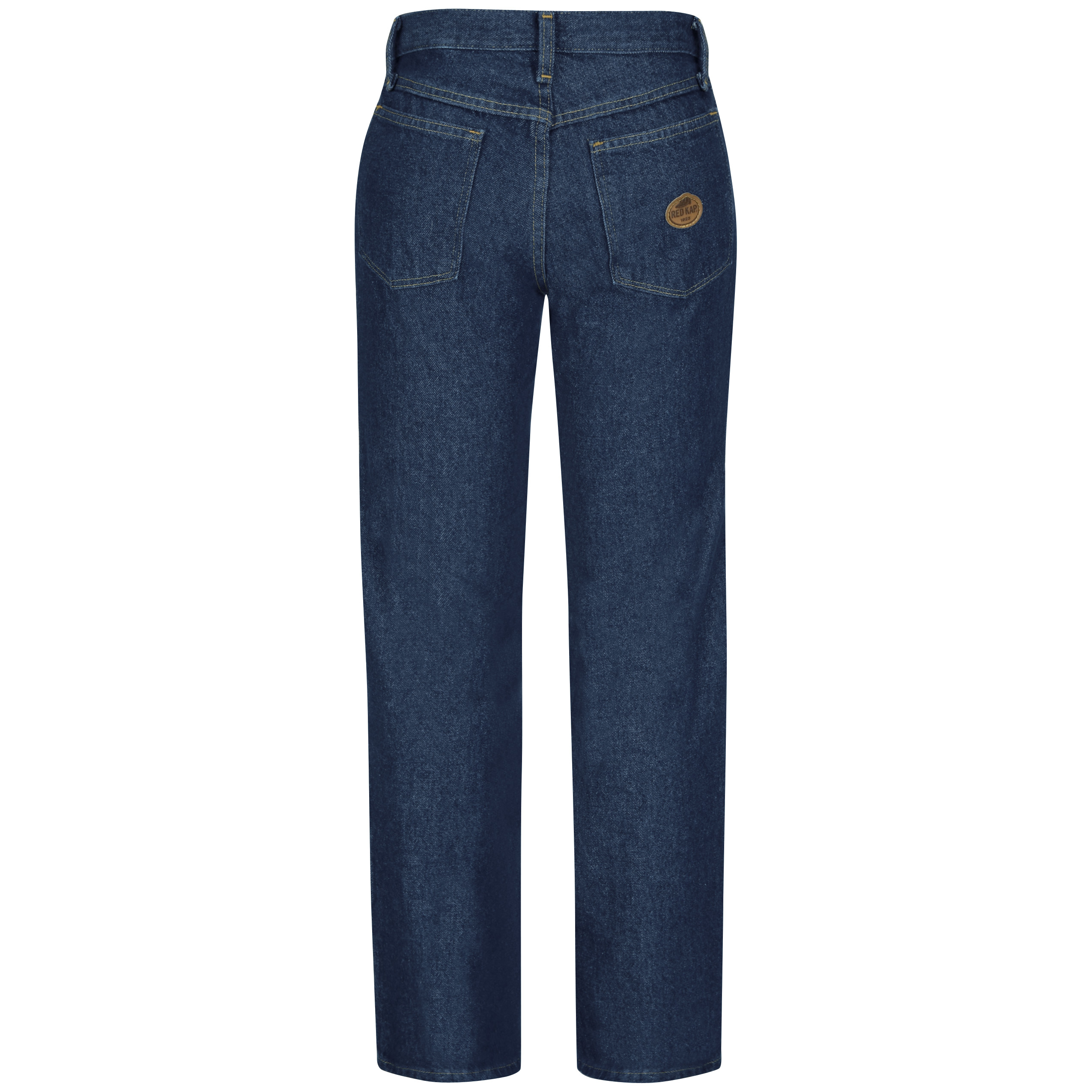 Get up and go with our easy-on women’s straight fit jean. Cut in a modern style, the slimmer legs fit over your boots and antique brass rivets give the jeans enhanced durability. The one-piece waistband with button closure provide a snug fit, while the decorative stitching and leatherette logo on the back pocket add a hint of style. These jeans are perfect for work and for after hours.