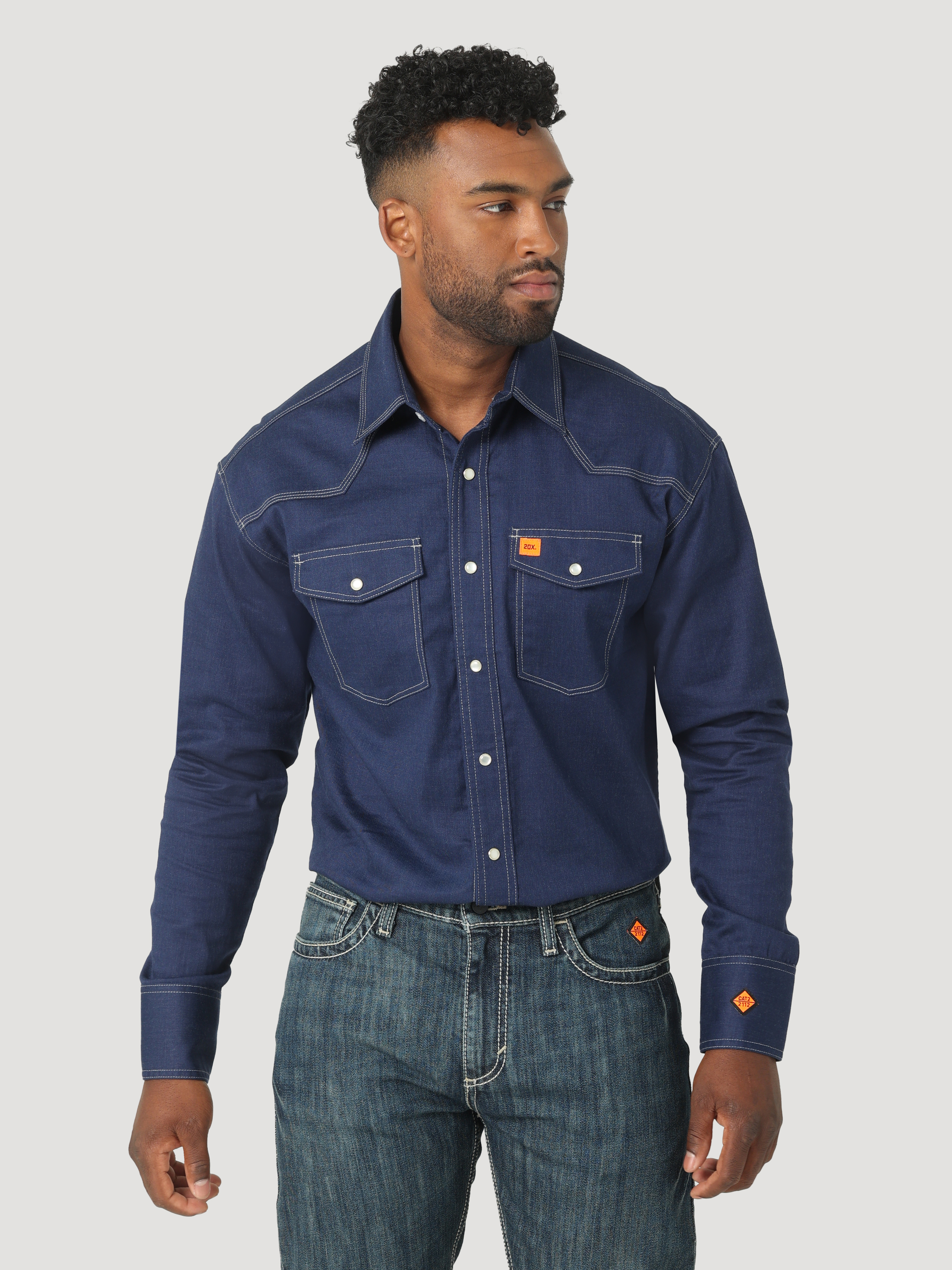 Flame Resistant Long Sleeve Work Shirt, Two Flap Front Chest Pockets with Snap Closure, Contrast Stitching, Safety Orange Outside Labels For High Visibility.
