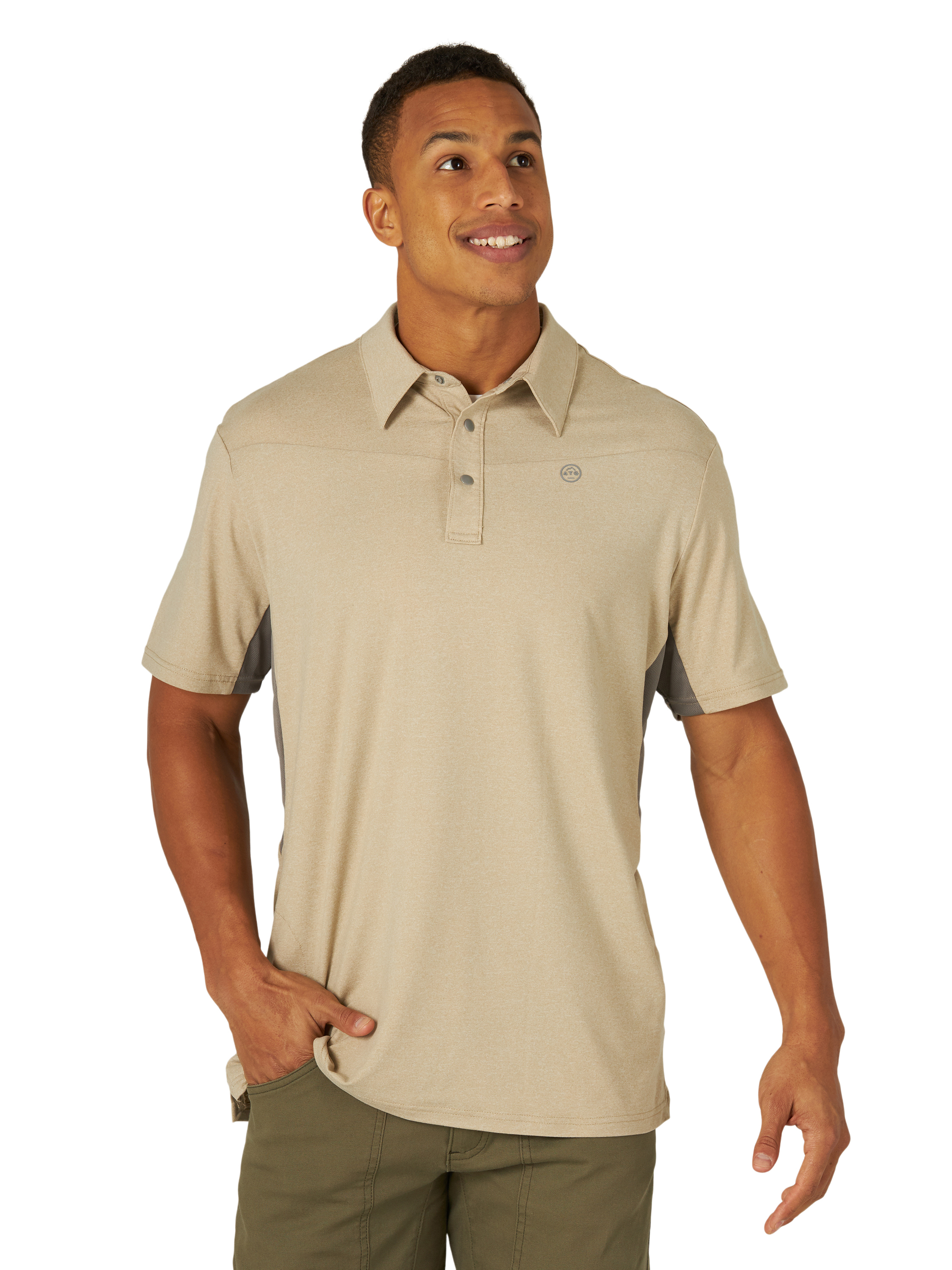 Outdoor Knit Short Sleeve Polo Shirt, Regular Fit Hidden Side Zip Pocket with Mesh Bag, Screen Print, Lockerloop Outside Back Neck, Underarm Gusset.
